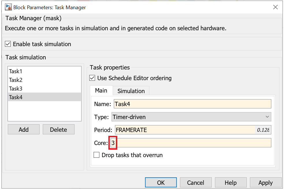 The task partitions are scheduled for real time execution using the Task Manager block in the top model. The Task Manager blocks sets tasks for each task partition described in the model in the previous step. The tasks are set for the same period as the corresponding partition.