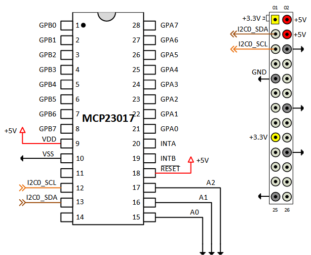 Since MCP23017 is powered by +5V, the output pins show +5V when they are set to logic high. The +5V voltage rail on the Raspberry Pi expansion header is not subject to a 50 mA limit as is the case for +3.3V voltage rail, providing more latitude for power consumption. It is safe to connect the SDA and SCL pins directly to the Raspberry Pi hardware because there are resistors on the Raspberry Pi hardware that pull these two signal lines to +3.3V. Make sure that you do not connect any of the MCP23017 output pins directly to the Raspberry Pi hardware.