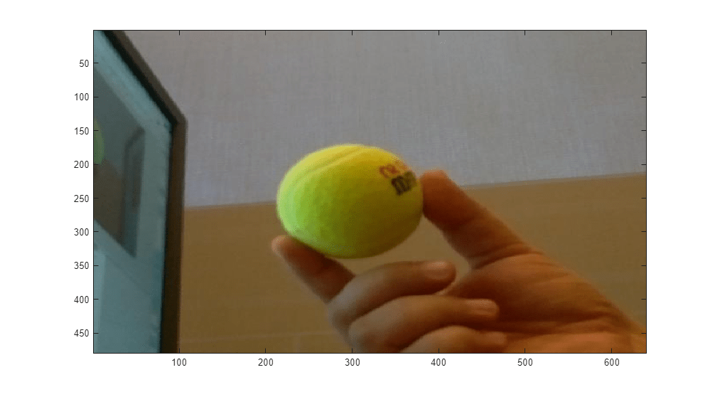 The function trackball() takes an image and a threshold for green detection and returns the results of green detection algorithm. We will call this function on the images captured in a loop. Before running the MATLAB code snippet below, get hold of a tennis ball and place it in the view of the Raspberry Pi Camera Board. While the MATLAB code is running, move the ball around.