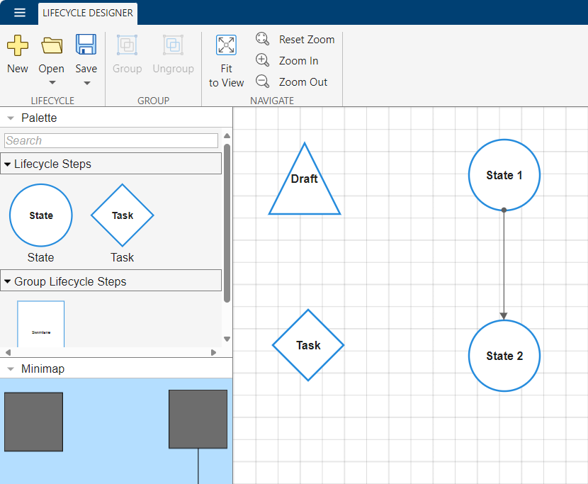 Each Modelscape model must be associated with a lifecycle. A lifecycle is a set of possible states the model can inhabit, as well as the transitions between them. Each model version must be in one of the states of the lifecycle.
