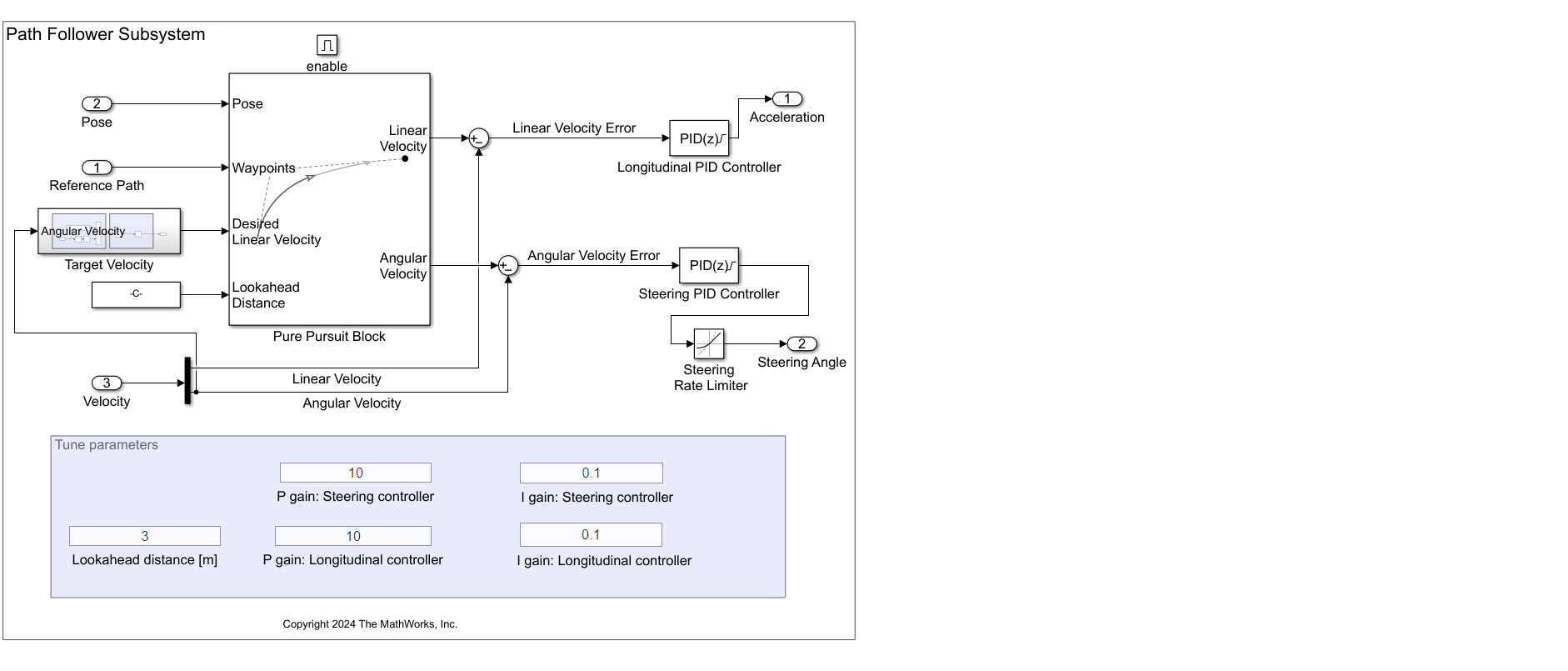 The Path Follower subsystem computes the acceleration and steering angle using these three main components: