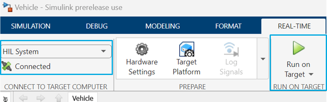 Open the Vehicle model. In the Real-Time tab, select HIL System. Ensure that the HIL system is connected to the Speedgoat target machine. Select Run on Target to compile and deploy the Vehicle model on the HIL system.