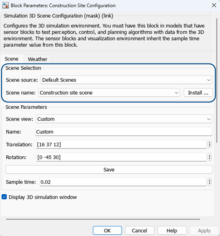 • Construction Site Scene using the Simulation 3D Scene Configuration (Simulink 3D Animation) block by setting the Scene source to Default Scenes and Scene name to Construction site scene.