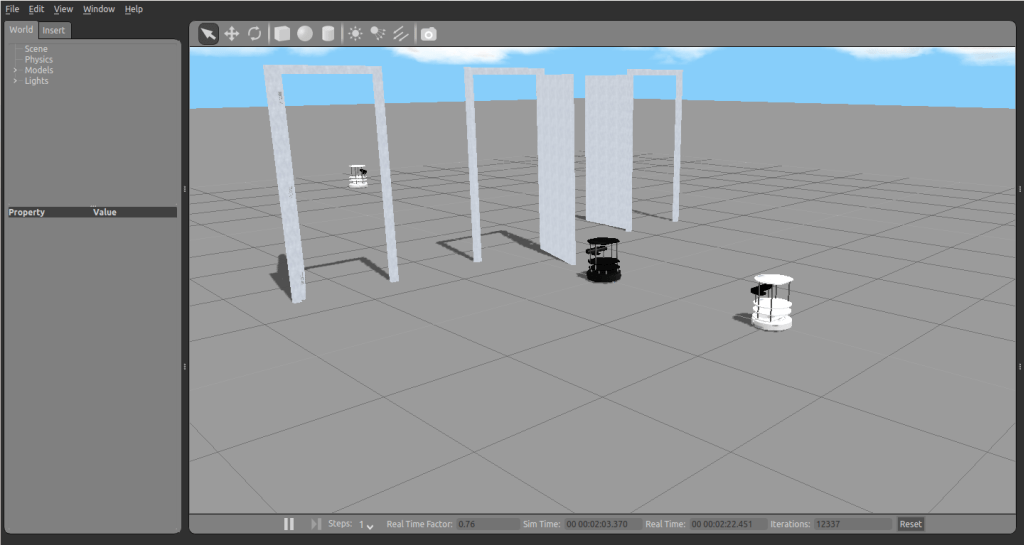 Note: When the Gazebo simulation is left idle, movable items often drift. If you see the doors moving slowly without a command, this behavior is normal. This happens because there is often more friction in the real world than there is in the ideal setting of the Gazebo simulator.