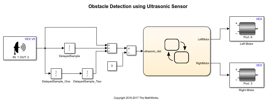 In this task, you will learn a way to model the logic for using the Ultrasonic Sensor block output to control the speed of the two DC motors, thereby controlling the motion of the robot. The logic for controlling the motor speed is implemented in a Stateflow chart. You will then build and download the model to the VEX microcontroller.