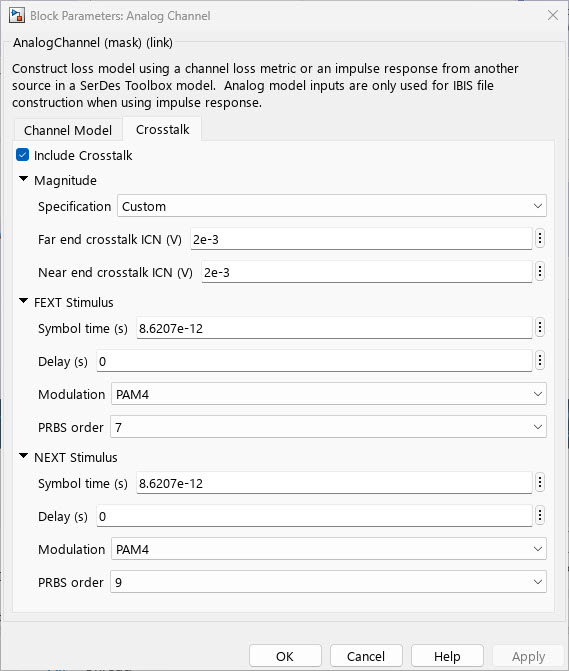 Open the Block Parameter dialog box for the Analog Channel block and update the settings. On the Crosstalk tab: