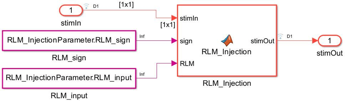 Next, look under the mask of the RLM_Injection block. Delete the Pass-Through block, then add a MATLAB Function block to the canvas. Edit the MATLAB Function block and replace the entire contents with the following code: