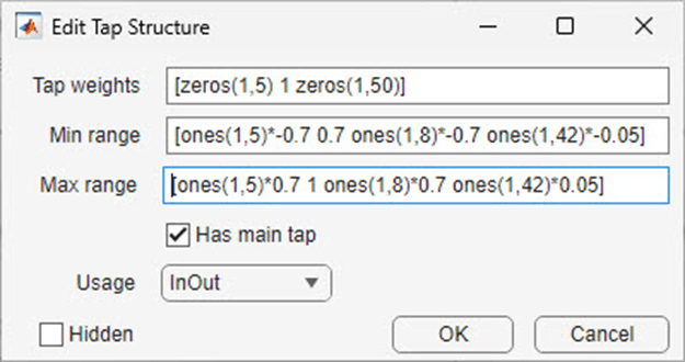 To update the number of taps and their ranges, in the IBIS-AMI Manager edit the Rx_FFE TapWeights parameter as follows: