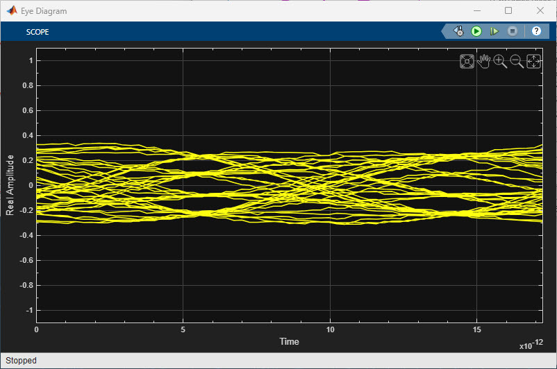 In this example the ADC quantization is also set to 6b by default, and you can change this value as needed, or to observe how the time-domain eye shape is affected by ADC precision. To change the ADC quantization (resolution), update the Resolution (bits) field in the ADC mask.