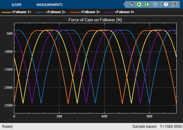 Simulate the model to view the knife-edge follower positions.