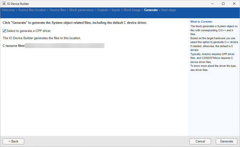 The app displays the location of the System object file on the Generate page. Choose the Select to generate a C++ driver option, if you want to generate a C++ file.