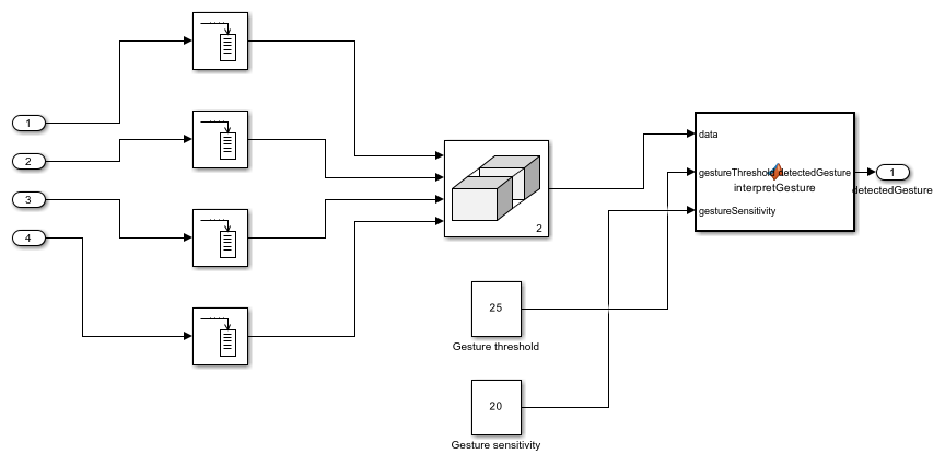 The algorithm in the 'interpretGesture' MATLAB Function block interprets gestures based on gesture data from the UDLR gesture sensor, gesture threshold and gesture sensitivity.