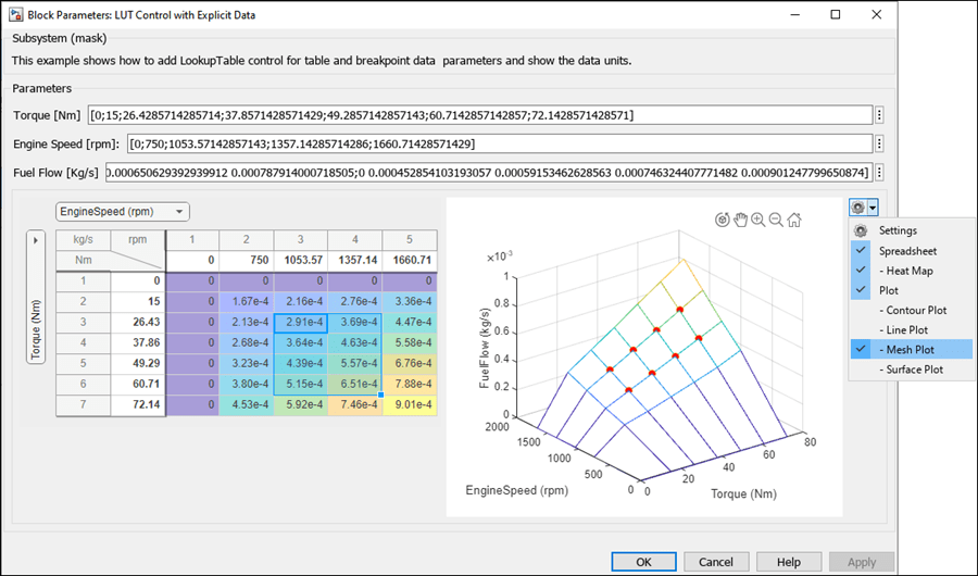 Plot multidimensional lookup data in a contour, mesh, line, or surface plot. Click a table cell to highlight the corresponding plot point. You can also create a plot from only a subset of dimensions or slices.