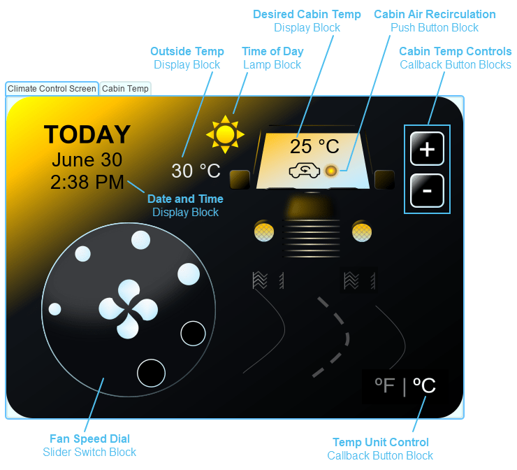 This example shows how to create a climate control screen for an automotive infotainment system, modeled as a dashboard panel. You can use panels to model and test the user interface of a real system. To model displays and controls on the panel, such as gauges, lamps, knobs, buttons, and switches, you can promote dashboard blocks to the panel. Dashboard blocks are blocks from the Dashboard library, the Customizable Blocks library, and the Aerospace Blockset™ Flight Instruments library.