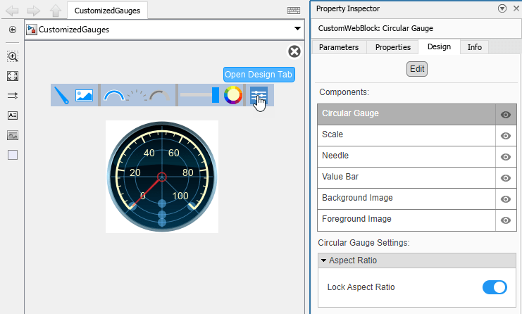 On the Gauge tab, click Edit. A toolbar appears above the Circular Gauge block.