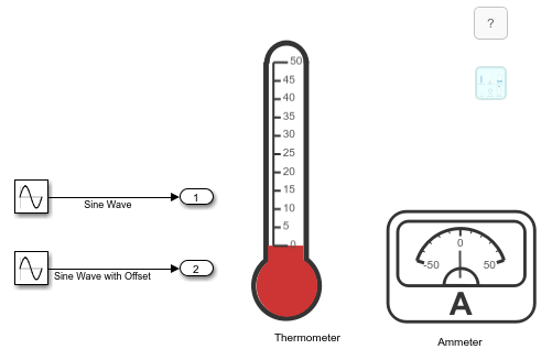 You can design custom gauges that look like displays in a real system or animate a signal using the Circular Gauge, Horizontal Gauge, and Vertical Gauge blocks. This example gives step-by-step guidance to design a thermometer using the Vertical Gauge block and an ammeter using the Circular Gauge block.