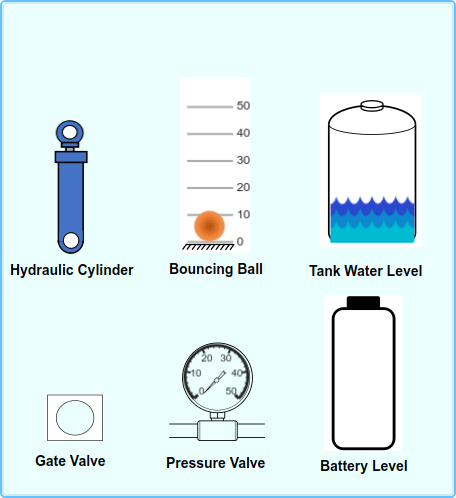The ammeter designed using the Circular Gauge block uses a background image to define the appearance of the ammeter, and uses a needle image and a value bar to indicate the value of the connected signal during simulation. The Pressure Gauge block in the panel uses a similar design strategy.