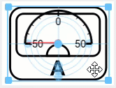 The needle image is a straight black line. The saved image is too large for the size of the block and oriented so that the needle does not point to the zero point on the scale. To rotate the needle image, click the needle rotation button in the block. Then, use the needle grab handles in the block to resize and reposition the needle so it starts at the center of the semicircle in the background image and ends before the label for the scale minimum.