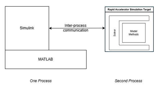 Rapid accelerator mode creates a rapid accelerator simulation target from your model. This simulation target includes the solver and model methods, but it resides outside of MATLAB and Simulink. It uses inter-process communication to communicate with Simulink.