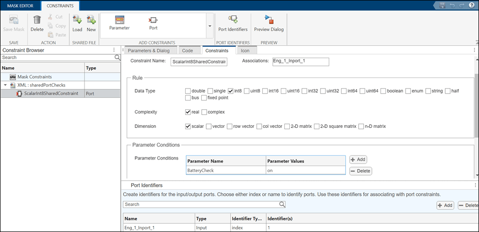 Open the model slexMaskPortConstraint and refer to the subsystem blocks, Engine_1 and Engine_2. The shared port constraint ScalarInt8SharedConstraint is saved in an XML file sharedPortChecks.xml. The constraint validates whether the signals at input ports at index 1 of the subsystem blocks are int8, scalar, and real at compile time.