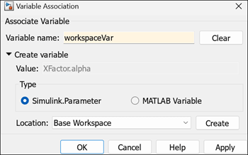 8. Select Associate Variable. Specify Variable name as worspaceVar to associate the variable workspaceVar with the popup parameter. You can also create a new variable of type Simulink.Parameter or MATLAB Variable in one of the available locations in the Locations list and associate it with the popup parameter.