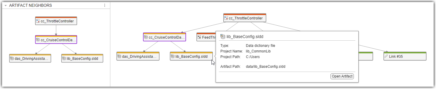 3. View the direct artifact relationships, such as the direct connections between data dictionaries and model block diagrams, by clicking an artifact and checking the Artifact Neighbors panel. To view detailed information about an artifact, point to the artifact in the trace view.