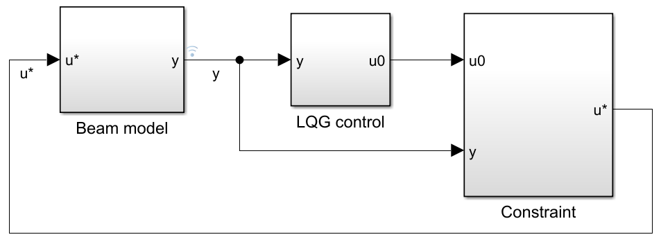Before you apply the constraints, design an LQG controller for the beam model. LQG control is a natural formulation for active vibration control. The LQG control setup is depicted in this figure.