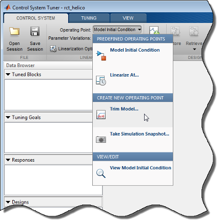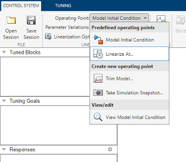 When you are ready to analyze responses or tune your model, select the operating point at which you want to linearize the model. In the Control System tab, in the Operating Point menu, stored operating points are available.
