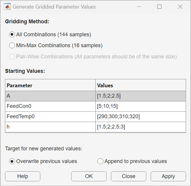To create an exhaustive combination of parameter values, select All Combinations as the Gridding Method and click OK.
