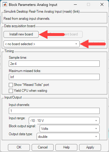 Open the Analog Input and Analog Output blocks and select your data acquisition board. If there is no board installed, install it by clicking the Install new board button.