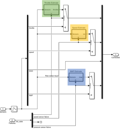 Throttle Estimate: The lookup tableThrott Estimation Table (2-D)estimates the throttle position based on the values of speed and pressure.Speed Estimate: The lookup tableSpeed Table (2-D)estimates the speed based on the estimated value of throttle position and pressure.MAP Estimate: The lookup tablePressure Estimate (2-D)estimates the MAP based on the estimated value of speed and throttle.