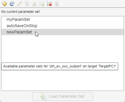 TargetSourceproperty is disconnected or not loaded with a real-time applicationThe parameter set button is enabled when the real-time application is loaded on the target computer. The button tooltip specifies the real-time application and the target computer name.