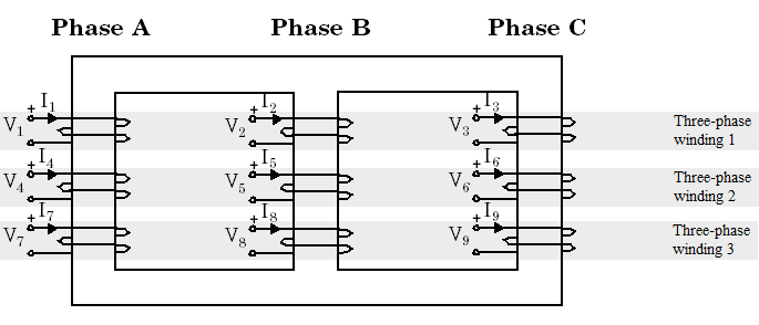 Do not confuse the phase winding numbers (1, 2, and 3) with the numbers used to identify the three-phase windings of the transformer. Three-phase winding 1 consists of phase windings 1, 2, 3, three-phase winding 2 consists of phase windings 4, 5, 6, and three-phase winding 3 consists of phase windings 7, 8, 9.