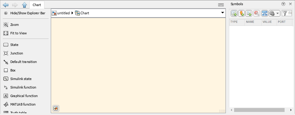 • Symbols pane — A pane, located to the right of the canvas by default, in which you create and manage data, events, and messages that allow the chart to communicate with the rest of the Simulink model.
