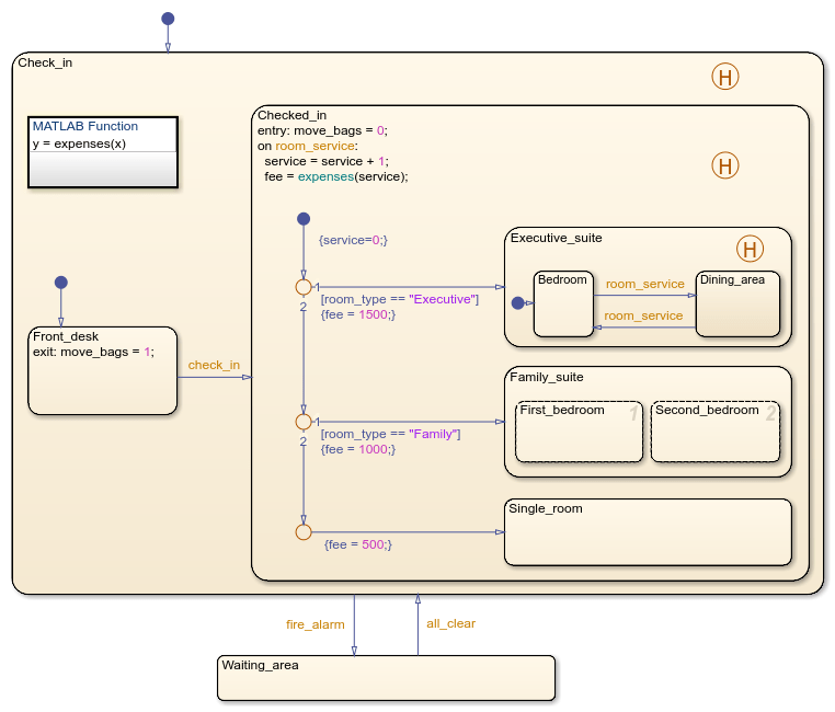 After the chart executes the entry actions in the Checked_in state, it evaluates the default transition path to one of the substates. The substate that becomes active corresponds to the room type. If you choose an executive suite, the base fee is $1500. If you choose a family suite, the base fee is $1000. If you choose a single room, the base fee is $500.