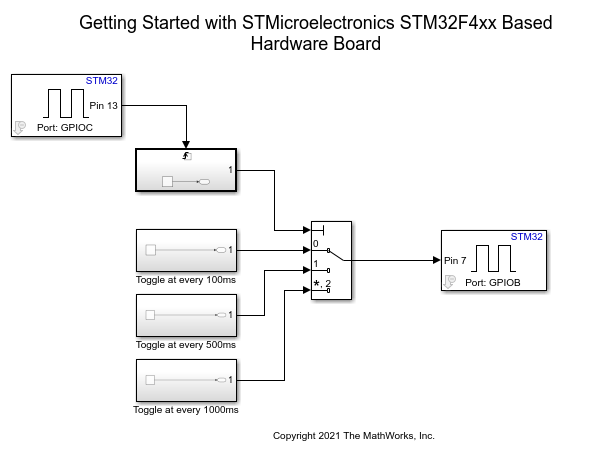 This example shows how to use the STM32™ Microcontroller Blockset to run a Simulink® model on an STMicroelectronics® STM32 Processor Based hardware board.