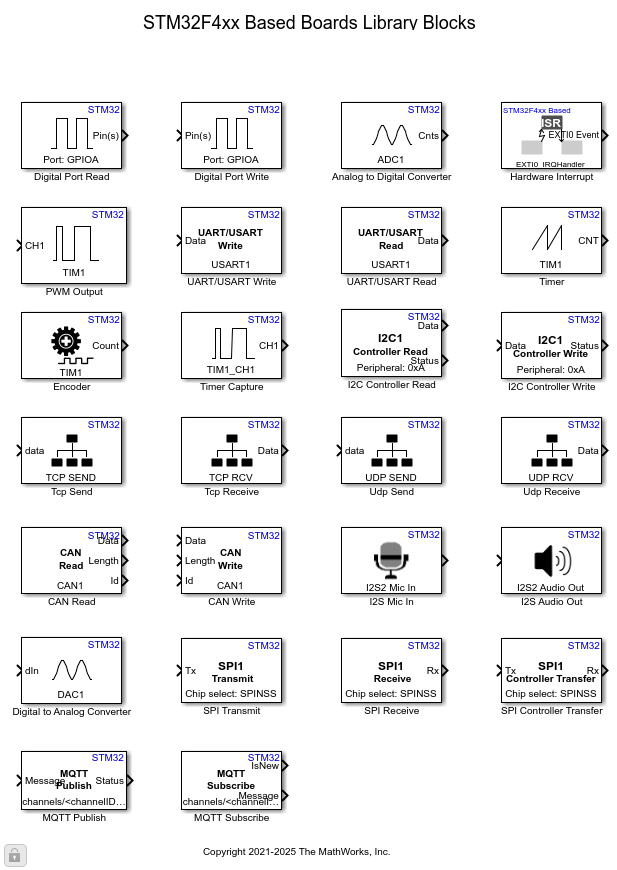 The STM32 Microcontroller Blockset enables you to create algorithms that use peripherals supported with dedicated blocks that can be added to your Simulink model. Use the STM32 Processor Based driver blocks to configure the associated sensors and actuators and read data from a peripheral or send data to a peripheral.