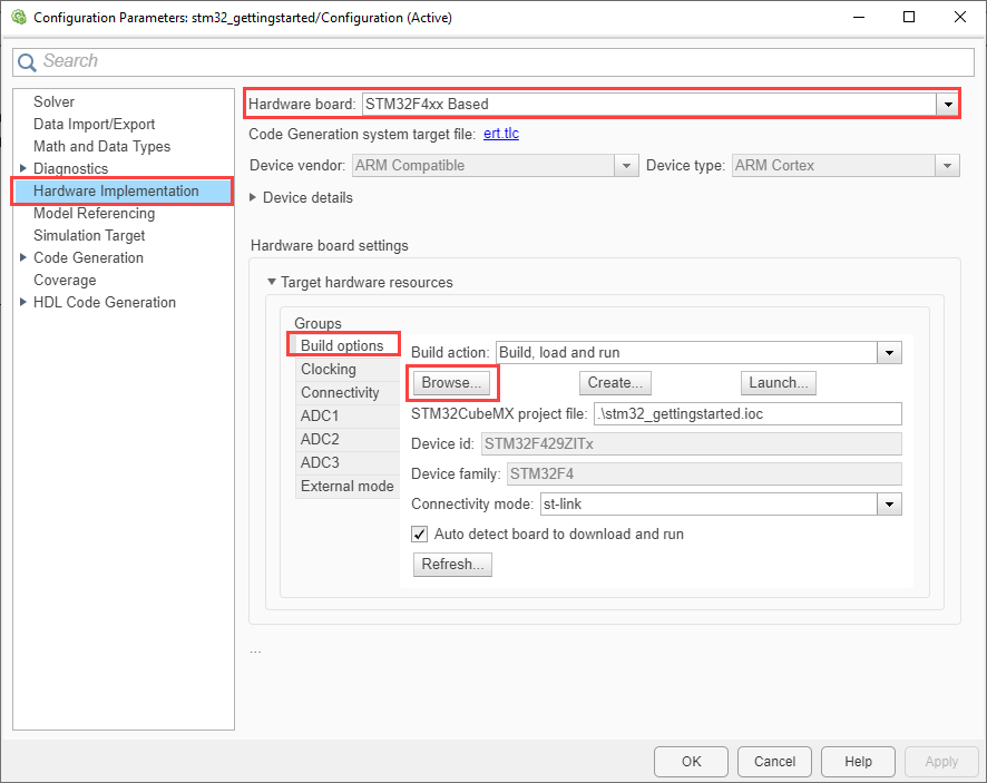 You can choose an existing STM32CubeMX project or create a new one. You can launch the project from your Simulink model. Follow the following instructions to create a model to support your STM32 processor based board: