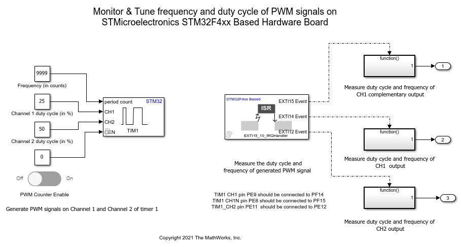 In this example you will learn how to use and generate code for PWM Output block in Simulink model for STMicroelectronics® NUCLEO-F429ZI board to generate PWM signals on Channel 1 and Channel 2 of Timer module 1. You will also learn how to monitor and tune the frequency and duty cycle of the generated PWM output
