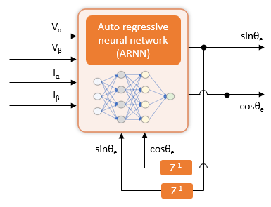 Therefore, you must train the neural network using the Vα, Vβ, Iα, Iβ, and θe data so that it can accurately map the inputs into the output and act like a virtual position sensor by estimating the rotor position.