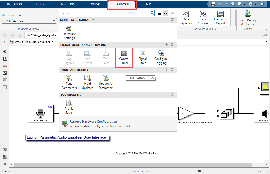 Follow these steps to configure the stm32f4discovery_audio_equalizer.slx Parametric Audio Equalizer for STM32F4-Discovery model: