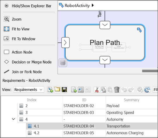 Requirements are a collection of statements describing the desired behavior and characteristics of a system. Requirements help ensure system design integrity and should be achievable, verifiable, unambiguous, and consistent with each other. Each level of design should have appropriate requirements. You can link requirements to elements of your activity diagrams to ensure traceability and verify that the behavior of the system aligns with the specified needs. A Requirements Toolbox™ license is required to link, trace, and manage requirements in System Composer™.