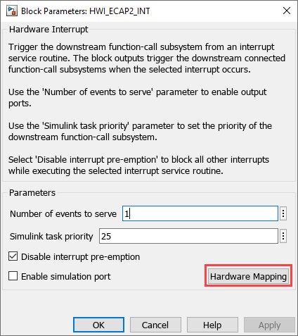 The Hardware Mapping tool allows you to configure the hardware interrupts tasks for the selected hardware board. With this tool, you can map the tasks in your software model to the available event sources and interrupts.
