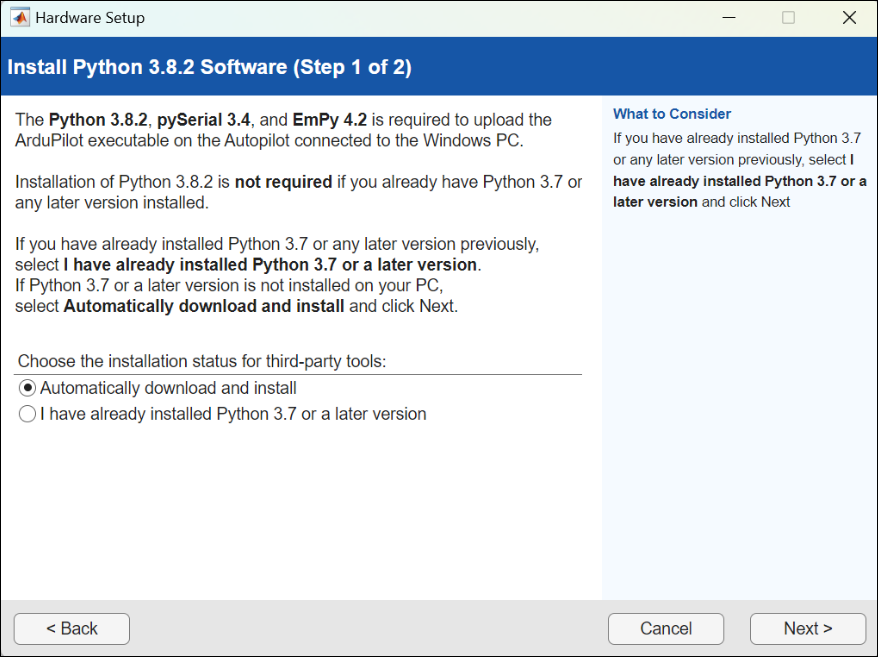 This section helps you complete the Install Python 3.8.2 Software step of the Hardware Setup process (using the Hardware Setup screens).