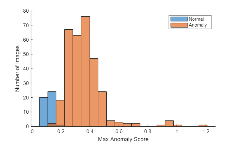 numBins = 20; [~,edges] = histcounts(calScores,numBins); figure hold on hNormal = histogram(calScoresNormal,edges); hAnomaly = histogram(calScoresAnomaly,edges); hold off legend([hNormal hAnomaly],"Normal","Anomaly") xlabel("Max Anomaly Score") ylabel("Number of Images")
