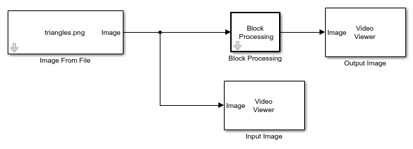 The Block Processing block divides the input image of size 64-by-64 into 4 blocks, each of size 32-by-32. It performs a transpose operation on each block, and then reassembles the transposed blocks to construct an output image of size 64-by-64.