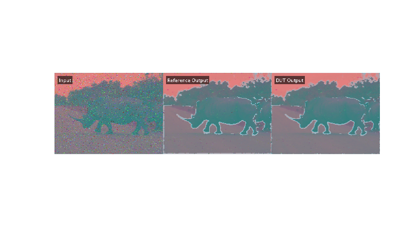 The FBVP_SLTestbench script validates processed frames from simulation against the reference. It calculates SSIM for the output frames obtained from simulation against the MATLAB reference and verifies that the SSIM exceeds the minimum threshold. The reference is calculated using FBVP_iptPipeline, that is shipped along with MATLAB example. The script displays the input frame, reference output, and DUT output.