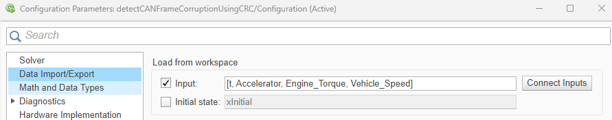 The input data is defined through Inport blocks, therefore the input signals are specified in the Configuration Parameters as follows:
