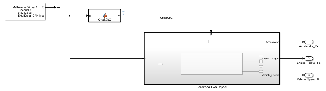 Upon reception, the MATLAB function CheckCRC computes the check value based on the payload, and returns true if the value is equal to the value received in the message. This boolean output is, in turn, used to conditionally control the CAN Unpack block, so that processing of incoming messages is interrupted if an invalid CRC value is detected.
