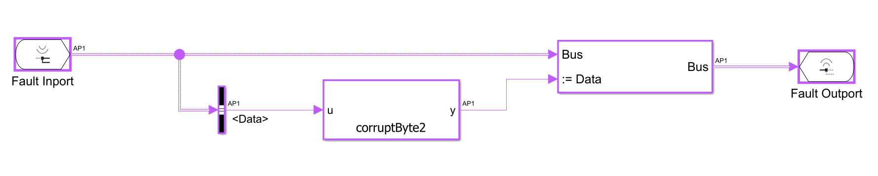 The fault model diagram, stored in the model detectCANFrameCorruptionUsingCRC_FaultModel and accessible from the Simulink Fault Analyzer™ interface, is shown in the following figure. The payload corruption is implemented using a MATLAB function corruptByte2, which flips a random bit in byte 2 of the payload.